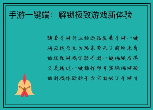 手游一键端,以其多平台兼容、端游级操作、丰富外设支持和便捷社交系统的特点,为玩家带来了极致的游戏体验。它打破了手游与端游之间的界限,让玩家可以在移动设备上享受端游般的游戏乐趣。相信随着手游一键端技术的不断进步,未来将会为玩家带来更加丰富的游戏体验和无限的可能性。
